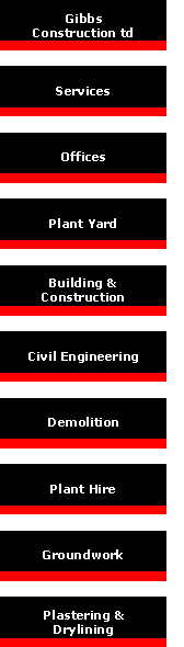 Gibbs Construction provide a wide range of construction and property related services . Each service is undertaken by one of our specialist divisions operating alone or in conjunction with our other divisions or supply chain partners . The principle services offered by the divisions are : Building and Construction Civil Engineering Demolition Groundwork Plant Hire Plastering & Drylining Property Development RC Works Waste Carrying & Brokering |